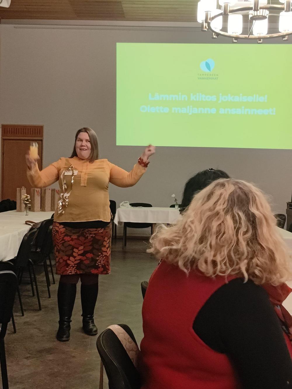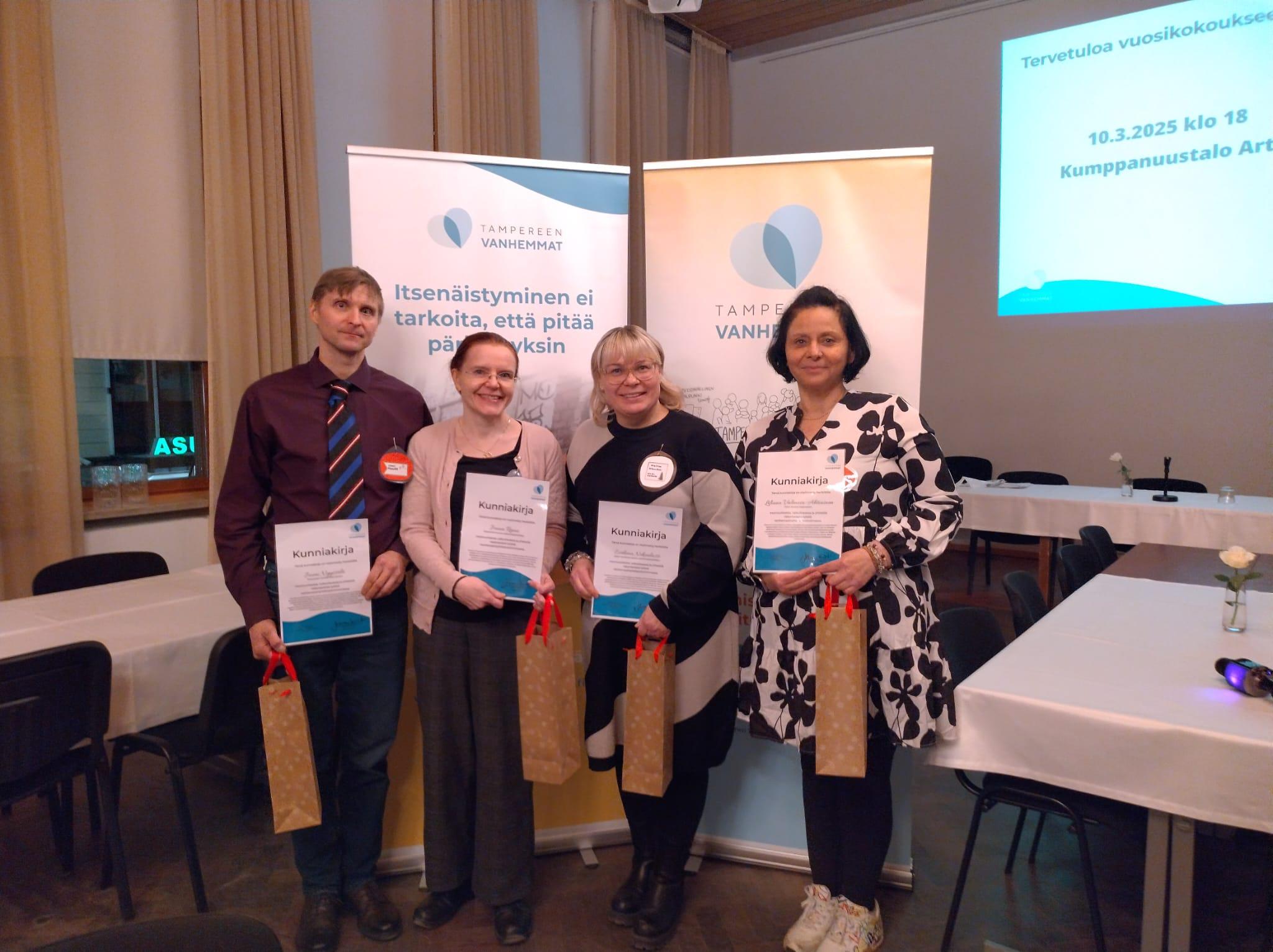 Varainkeruukeskustelua kesti tovin, jonka jälkeen nämä keskustelut käytiin läpi porukalla lyhyesti, jakaen parhaat palat ryhmien keskusteluista. Sitten koitti jälkiruoka ja yllätyksenä muutamille, kunniamainintojen jakoa. Neljä pitkän linjan vanhempainyhdistysaktiivia palkittiin Tampereen vanhempien kunniakirjoin ja lahjapaketein, joukossa ensimmäinen Tampereen Vanhempien alumnimaininta Jouni Nyyssölälle. Kunniamaininnan sai Jounin lisäksi Jonna Rinne, Eveliina Nikunlassi sekä Liliana Valencia-Ahtiainen.