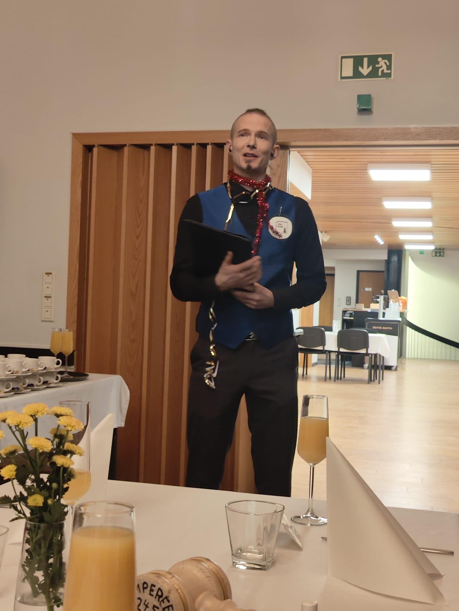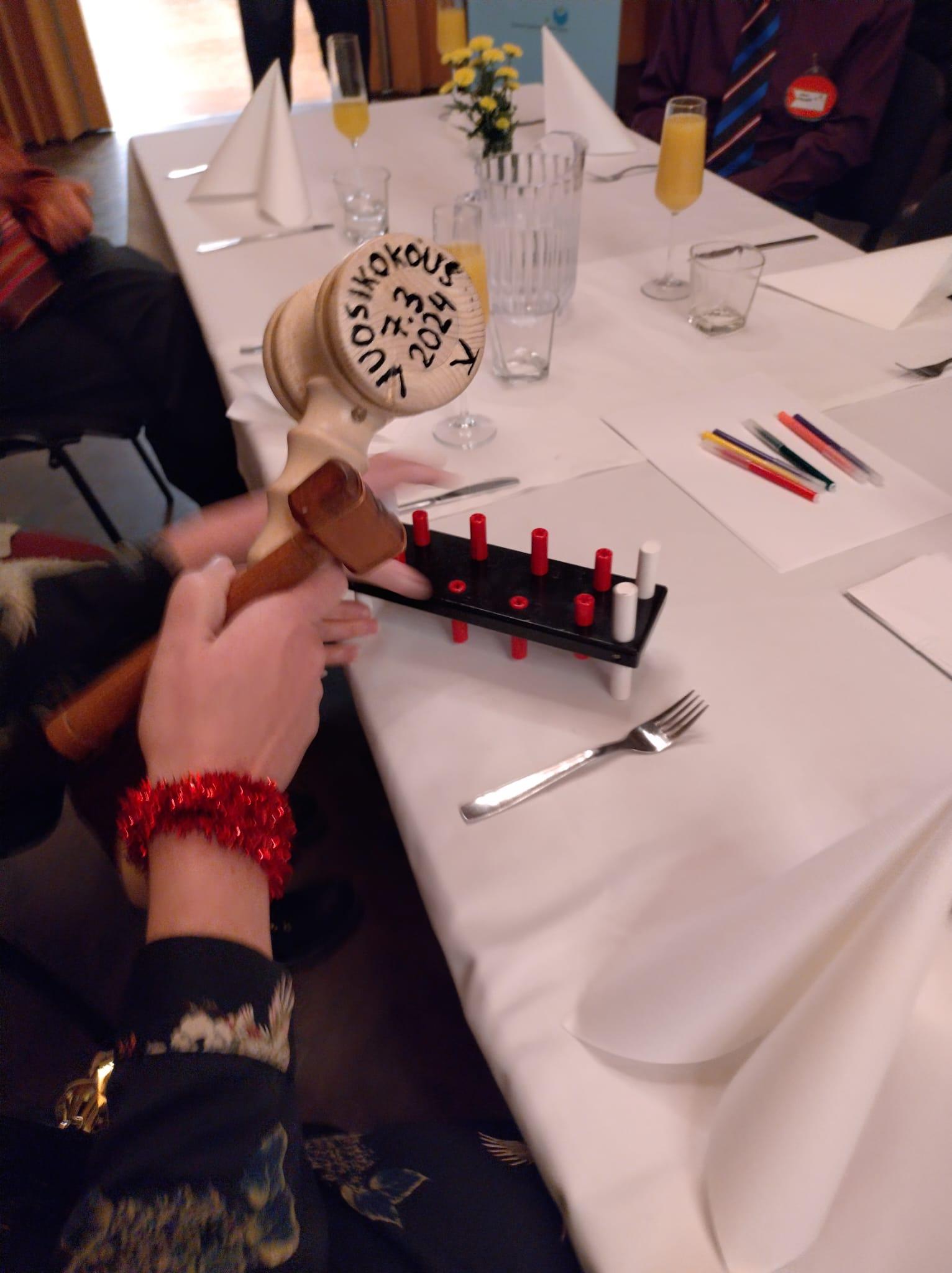 Ilta alkoi juhlallisesti Tampereen Vanhempien puheenjohtajan Johanna Kivistön pienellä puheella ja alkumaljoilla, ja sen jälkeen illan seremoniamestari Marianne Stenholm ohjasi meidät kohti itse kastetta, jossa jokainen pääsi osoittamaan kykynsä nuijan kanssa. Hakka-hakka kiersi jokaisen läpi ja kukin persoonallisella tavallaan hakkasi palikoita, valiten ison tai pienen nuijan. Sitten saimme kuulla TreVaRyn hallituksen jäsenen, Juri Uljaan, tekemän runon varta vasten meitä varten kirjoitettuna.